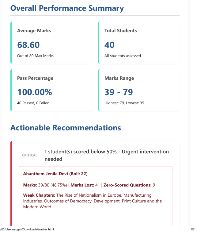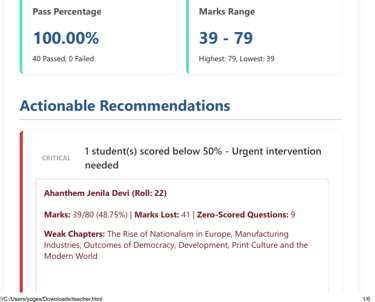 In-depth reports for better insights. Individual students reports along with teachers reports so that actions can be taken based on historic and AI generated data.